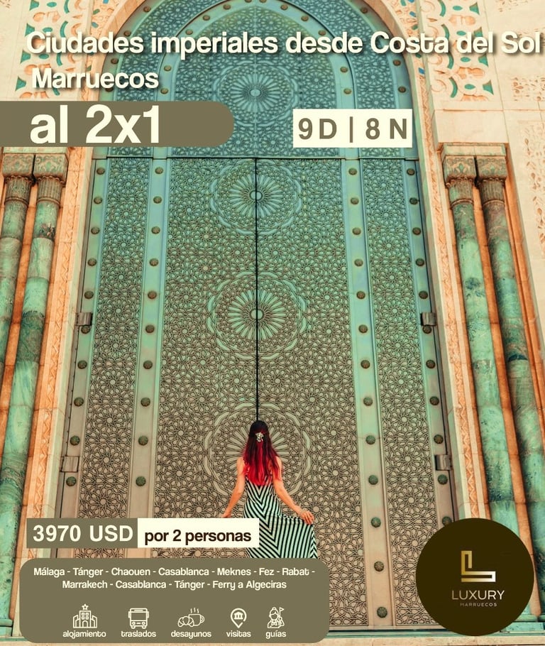 Vamos en grupo, por pareja o decídete y atrévete a realizar el viaje de tu vida de forma individual; podrás pasear y visitar sus medinas llenas de vida e historia en Fez, Marrakech o Essaouira.